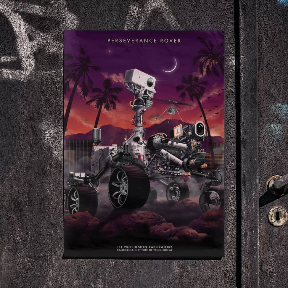 Oxcart Assembly is excited to present the NASA Center Poster Series by Neal Williams. In conjunction with the NASA Ames Research Center Exchange, Oxcart Assembly has conceptualized a set of high quality, limited-edition collectible posters hand-drawn by artist Neal Williams of Epic Problems Print Shop and Design Studio and screen-printed on the highest quality paper. Neal recently created the official poster for SXSW 2020’s film festival and is one of the industry’s highest regarded artists. The series kicks off with the Jet Propulsion Laboratory (JPL) and commemorates the successful landing of the Mars Perseverance Rover and Mars Ingenuity Helicopter on February 18th, 2021, with additional posters on a regular schedule to match NASA Mission highlights.